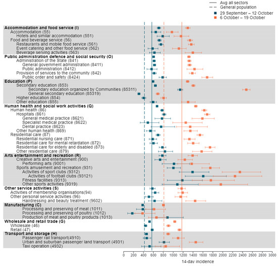 The accommodation and food service incidence is of a comparably high level as that of the health and care sectors and is similar between hotels, restaurants, and bars between 29 September–12 October (Figure 1, Tables S1–S5). Within public administration, defence and social security, the incidence in governmental and general administration services and the public order and safety sector exceeds the all-sector average and is comparable to the incidences in the health and care sectors (Figure 1).