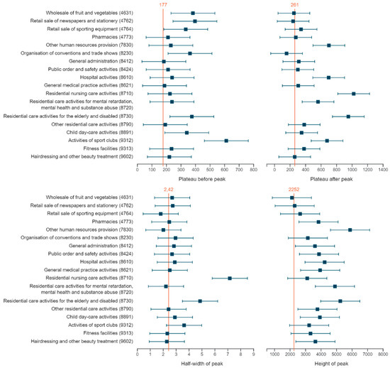 Forest plots of characteristics of the longitudinal profile of selected sectors. The plateaus before and after the peak are related to the 14-day incidence. The height of the peak is the 14-day incidence at the highest moment in the curve and the half-width of the peak is the number of weeks it takes for the curve to reduce the 14-day incidence by a half.