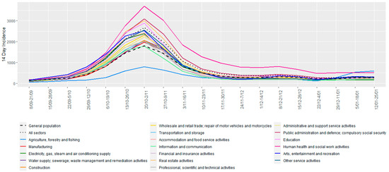 Both the cross-sectional and longitudinal analyses show that for the majority of sectors, the autumn wave reaches its peak incidence around 20 October–2 November 2020 (Figure 3), which is significantly higher for human health and residential care activities (Figure 2 and Figure 3). Within human health activities, both hospitals and general medical practice have a higher incidence, while for residential care activities, most sectors show an extreme peak (sectors 872, 873, 879) (Figure 2). At level 4, additionally fitness centre activities, non-medical contact professions, general administration, federal and local police, pharmacies, and other human resource provision have a significantly elevated peak incidence (Figure 2).