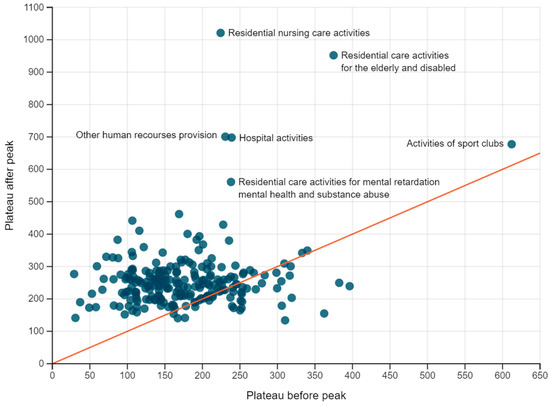 Two parameters in the longitudinal analysis inform us about the effect of the stricter NPIs of 19 October 2020. The plateau after the peak captures the incidence of which the sector decreased, while the half-width quantifies the speed of decrease. Not surprisingly, human health and residential care activities have a significantly higher post-peak incidence level compared to the other sectors, while the latter sector also has a larger half-width (Figure 2 and Figure 3). Within human health activities, hospitals have a higher post-peak incidence, while for the residential care activities most sectors show both an increased incidence after the peak (sector 871, 872, 873), and a longer half-width (sector 871, 873). At level 4, activities of sports clubs, and other human resource provision (sector 7830), had a significantly elevated post-peak incidence (Figure 2). Of note, for most sectors the post-peak plateau is higher than the pre-peak one (Figure 4).