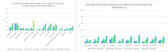In the contact tracing from IDEWE, the high-risk contacts of 6016 index cases were recorded between 29 October 2020 and 18 February 2021. The number of high-risk contacts per index case varied from 0 to 56, with more than 99% having less than 10 high-risk contacts. For 5952 index cases, the customer segment and region were known. The frequency of index cases that reported two or more high-risk contacts increased over time in most segments and all regions (Figure 5). Index cases in the segments emergency services, education, government, and public transport reported a higher mean number of high-risk contacts over this period, compared to other segments, while healthcare and accommodation and food trade and industry index cases reported relatively low values (Figure S1).