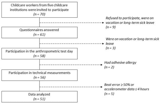 Five Danish childcare institutions agreed to participate and 70 of their workers handling children aged 3–6 years were invited to participate (n = 70; Figure 2). Nine of the childcare workers either did not want to participate, were on vacation or on long-term sick leave. Online questionnaires were answered by 61 childcare workers. After answering the online questionnaires, an additional three childcare workers went on vacation or sick leave. The remaining 58 childcare workers all completed the questionnaires and participated in the physical assessments. Two of the 58 childcare workers did not participate in the objective measurement due to adhesive allergy. Five of these fifty-six childcare workers were excluded from analysis due to having either ≤4 h of accelerometer measurements or beat errors ≥ 50% of the heart rate measurements. Fifty-one childcare workers had sufficient data from accelerometer and heart rate measurements and were included in the statistical analysis.