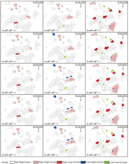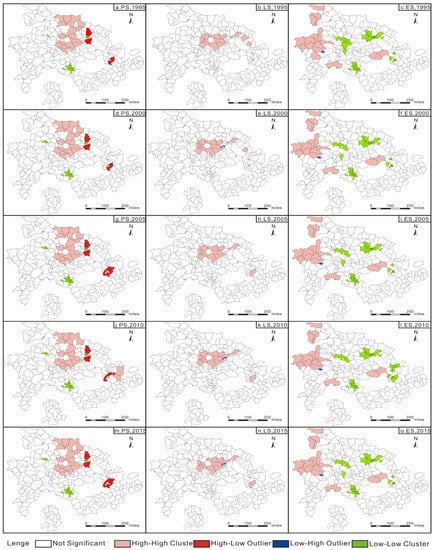 (2) From 1995 to 2015, the spatial aggregation characteristics of the PLES of the county-level cities in the urban agglomeration in the middle reaches of the Yangtze River were obvious, exhibiting positive spatial autocorrelation characteristics. From 1995 to 2015, the high-density areas (high-high category) and low-density areas (low-low category) of various PLES in resource-based cities and non-resource-based cities remained stable.