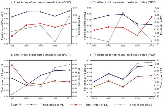 Results for the PLES-related Theil index of the two types of cities, 1995–2015.