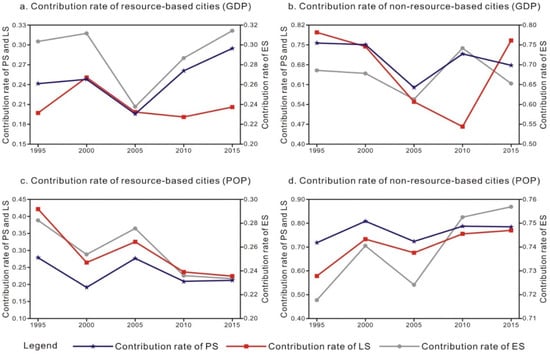 Based on the change trend, with the GDP as the weight, the contribution rates of the regional differences in the PLES of the resource-based cities exhibit an upward–downward–upward trend pattern. The contribution rate of the regional differences in the PS and ES of the non-resource-based cities indicate a downward–upward–downward trend pattern, while the contribution rate of the regional differences in the LS first decreases and then increases (Figure 7a,b). With the population as the weight, the contribution rate of the regional differences in the PLES of the two types of cities exhibits the opposite trend. In particular, the contribution rate of the regional differences in a certain type of PLES of the resource-based cities demonstrates a downward–upward–downward trend pattern, and the regional difference contribution rate of a certain type of PLES of the non-resource-based cities indicates an upward–downward–upward trend pattern (Figure 7c,d). Overall, the contribution rate of the regional differences in the PLES of the resource-based cities decreases, while the contribution rate of the regional differences in the PLES of the non-resource-based cities increases.
