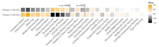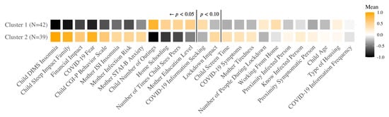 The optimal result of the hierarchical clustering algorithm led to two groups in the Swiss sample, for which the results are visualized in Figure 2. Likewise, the analysis led to a more symptomatic or risk cluster vs. a better-adapted cluster. Though importantly, while the Swiss symptomatic cluster expressed being impacted by the lockdown, in contrast to the French sample clustering analysis, child insomnia was not a significant factor differentiating these clusters. Rather, the clusters crucially differ (in ranked significance order, Cluster 2 positive differences) on the basis of lockdown impact, child screen time, child age, mother infection risk, home-schooling, and financial impact, and (Cluster 2 negative differences) mother education level, working from home, number of child outings, and COVID-19 symptoms. Table S5 in the Supplementary Materials provides the respective means (SD) for each cluster and the two-sample t-test significance levels between clusters. Unlike the French sample, here, the two clusters are significantly different in terms of child age (t(38) = −3.20, p ≤ 0.01), though still not gender (χ2(1) = 4.11 × 10−31, p = 1), and thus age may have played a significant role in determining these clusters, with a magnitude on par with the impact of the Swiss partial lockdown conditions.