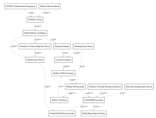 In France, the results of the clustering and multiple regression models demonstrate that sleep disorders in young children are mainly negatively associated with the mother’s COVID-19 fear, her anxiety, her insomnia, child hyperactivity, and the pandemic’s financial impact on the family. In the regression model, the mother knowing someone infected with COVID-19 was related to lower child insomnia, suggesting that such a personal rapport (e.g., where communication by phone, email, and internet is possible) may be informative, leading to a more realistic experience of the dangers associated with the disease rather than being too easily influenced by (e.g., fear-invoking) social media or unfounded personal hypotheses. In contrast, the proximity variable in the model measured specifically the extent to which the mother is habitually in close physical proximity to an infected person, and as expected (as a source of stress), was linked to higher child insomnia. Relationships were also observed between the child’s insomnia and his/her number of outings, home vs. regular schooling, and the mother’s education level. These results are in support of established theories on the bidirectional relationship of the mother’s well-being and the child’s quality of sleep [83]. In this respect, our results invite the interpretation that greater infection risk for the mother may provoke more fear of COVID-19, in turn generating more pandemic-related anxiety and insomnia, where cautious behaviors are produced, such as fewer child outings, therefore cascading into increased child hyperactivity and sleep disturbance. This interpretation is also supported by the SEM results discussed later, and elements of this modeling are corroborated by results of a previous study, in older children (9–12 years) [38]. Furthermore, financial impact was also found to be strongly linked to the mother’s anxiety (see [84]), which is well-known to lead to sleep disorders [85], and financial impact was also found to be significantly related to a negative overall perception or experience of the lockdown (variable: Lockdown Impact).