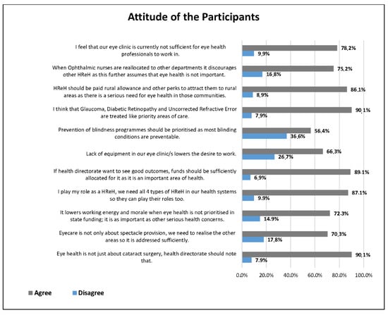 Health workers who have positive attitudes are more likely to follow standard procedures and apply themselves to their duties, whereas those with negative attitudes would not do the same [42]. In this study, the majority of the participants had positive attitudes regarding eye health. It was also found that the youngest participants had the most negative attitudes. The possible explanation for this is that the youngest participants generally came from the safe and sheltered environment of an academic institution, where there were systems and clear protocols. They had since entered a system that does not have clear processes and guidelines, no dedicated directorate, and no easily available supervision. In addition to the working environment, they generally did not have the basic equipment that they required to perform their basic tasks [24,43]. In realising this, they did not have an understanding supervisor who would realise that urgent procurement of basic equipment was a critical enabler for them to perform their duties. As a result, they found themselves lost. The reality of their internal managers not being trained in eye health, and being incapable of providing clinical guidance and support, might be part of the reason for their negative attitude towards it. In another study, HReH attitudes were far more favourable amongst themselves when they were discussing task sharing as opposed to when they were discussing it with management [44]. A recent study conducted among paediatricians in Jordan reported satisfactory attitudes regarding eye health and disorders [45].