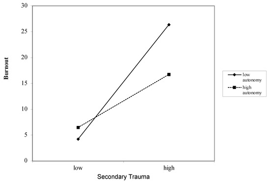 Graph of interaction plot between secondary trauma and autonomy. Perceived autonomy moderates the relationship between secondary trauma and burnout, such that those with low autonomy (1 SD below the mean) and high secondary trauma reported greater burnout.