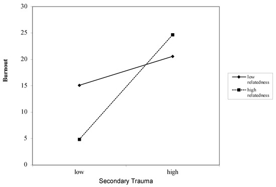 Graph of interaction plot between secondary trauma and relatedness. Perceived relatedness moderates the relationship between secondary trauma and burnout, such that those with low relatedness (1 SD below the mean) and high secondary trauma reported greater burnout.
