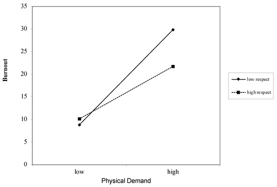Physical Demands as a Job Demand for Burnout (Table 5): Overall, physical demands were strongly associated with burnout (β = 0.50, p < 0.000). These associations remained after including the job resources of autonomy (β = −0.40, p < 0.000), competence (β = 0.44, p < 0.000), relatedness (β = 0.48, p < 0.000), impact (β = 0.50, p < 0.000), and respect (β = 0.50, p < 0.000). The interactions between physical demands and the job resource of respect (Figure 5) were found to be significant (β = −0.95, p =.05) (Figure 5). The interactions between physical demands and the other job resources were not found to be significant: autonomy (β = −0.64, p = 0.12), competence (β = −0.53, p = 0.31), relatedness (β = −0.56, p < = 0.32), and impact (β = 0.06, p = 0.94).