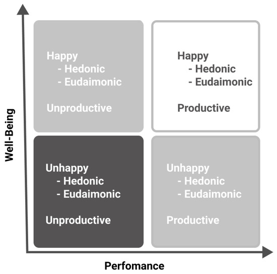 - Peiró, J.M.; Kozusznik, M.; Molina, I.R.; Tordera, N. The Happy-Productive Worker Model and beyond: Patterns of Wellbeing and Performance At work. Int. J. Environ. Res. Public Health 2019, 16, 479. [Google Scholar] [CrossRef] [PubMed] [Green Version]
