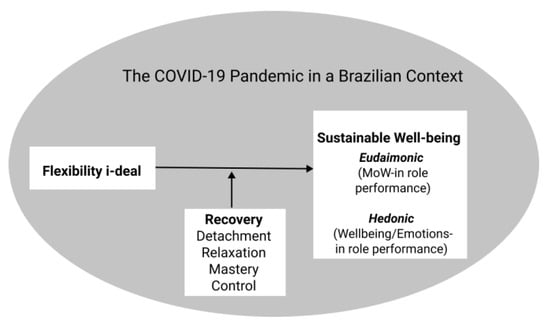 The three most common forms of i-deals are developmental, flexible, and workload reduction [39]. For this work, we will focus on flexibility i-deals, which are related to the work schedule. This type of i-deal is prevalent in organizations and has a strong potential to influence employees [40]. Due to the fast-paced pandemic and the home invasion of their job tasks, flexibility i-deals must be handled to help workers perform better in their work and private lives [19] and to increase well-being. Flexibility i-deals are likely to provide a better work-life balance, bringing more personal energies to their different roles [41]. The flexibility i-deals provide workers with the opportunity to fit with their jobs, broaden their action repertoires, become more focused, and support others [20]. On this basis, flexibility i-deals could be considered a resource to cope with the stressful pandemic environment in Brazil, helping to develop and maintain high levels of performance and well-being, in other words, fostering sustainable well-being at work [42]. Supportive management and job flexibility (e.g., flexible work schedules) have been important antecedents of well-being during the pandemic [2]. Workers value how and when to work more than ever. There is some evidence that flexibility i-deals have been established by some teleworkers in the pandemic environment in Brazil [43].