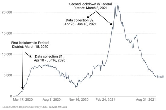Additionally, the privileged workers who remained in their jobs and became teleworkers had to manage uncertainties regarding their jobs, tasks, health, and families’ health, so they were also affected. As reported in the media, many people lost their jobs, and those who remained had to handle isolation or work–family conflicts, sometimes in overcrowded homes [2]. The high level of uncertainty in Brazil because of the government’s denial of the pandemic [6] could have damaged mental health consequences [2,57].