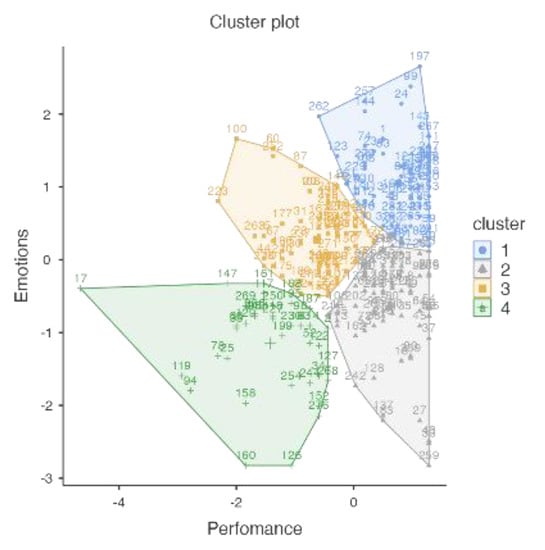 Figure 5 shows that the smaller cluster (N = 44) is also the one with the largest dispersion. This cluster is the unhappy-unproductive (Cluster 3).