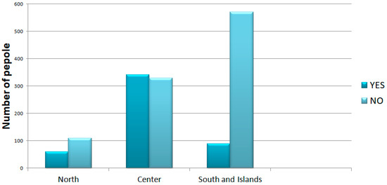 In question 10, participants were asked if they thought that their region managed the spread of the pandemic better than the other regions. The perception of the pandemic was also disastrous in central Italy (see Figure 1). The perception factor could be commonly correlated to an economic factor and to the availability of health facilities, which allowed some regions of Italy to have fewer victims and cases of hospitalization. For what concerns question 11, we were interested in investigating the participants’ compliance with the rules during the period of the pandemic. These data are not correlated with the number of infections in the different areas, or with the number of inhabitants (Figure 2).