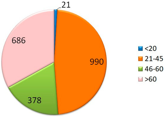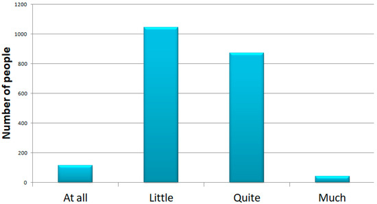 Questions 14 and 15 focused on physical and psychological stress. The results showed that 1537 (74%) of the participants answered that they felt they were in a situation of psychological stress, 208 (10%) answered no, and the other 330 responded saying low amounts of stress (16%). We showed that the majority of people suffered from psychological distress and that 70% of these were women; although it is important to note that the initial sample is composed by more women than men. Furthermore, we can see that the majority of people that answered “yes” were people ranging from 21 to 45 years of age (Figure 3 and Figure 4).