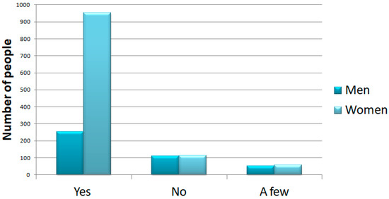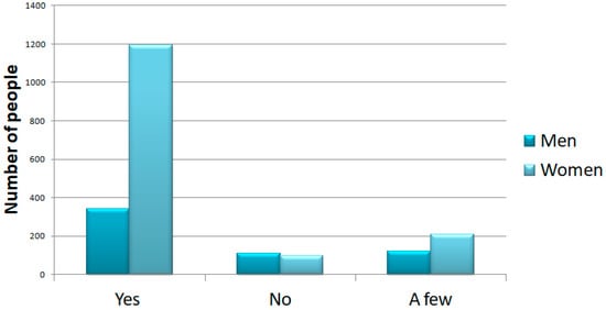 On the other hand, 1206 (78%) of participants answered that they felt they were in a situation of physical stress. The results showed that 221 (15%) answered “no”, and the other 110 “a little” (7%). Again, women were the ones who reported the greatest physical stress (Figure 5).