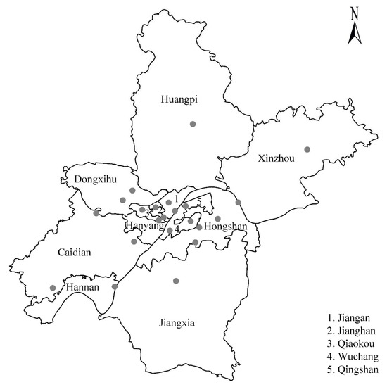 Location of the 22 air quality monitoring stations in Wuhan.
