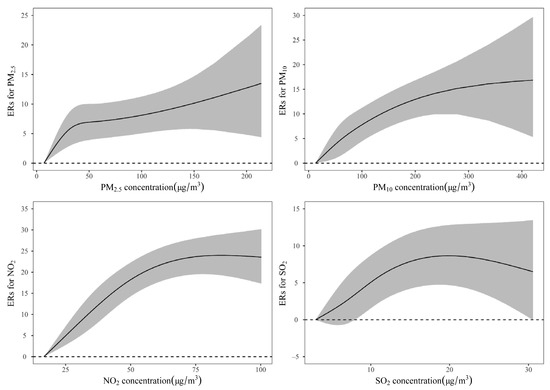 We performed a dose–effect analysis at the lag days where PM2.5, PM10, NO2, and SO2 had the strongest association with IHD hospitalization, that is, at lag0, lag01, lag0, and lag0, respectively. As shown in Figure 3, a clear dose–effect relationship exists between all the four different air pollutants and IHD hospitalization. PM2.5 represented a steep response at lower concentrations, which tended to change linearly as the concentration increased. The result of PM10 exhibited a relatively large fluctuation at lower concentrations, and reached a plateau at high concentrations. The performance of NO2 and SO2 at low concentrations was similar to that of PM10, but a decreasing trend was observed at high concentrations.