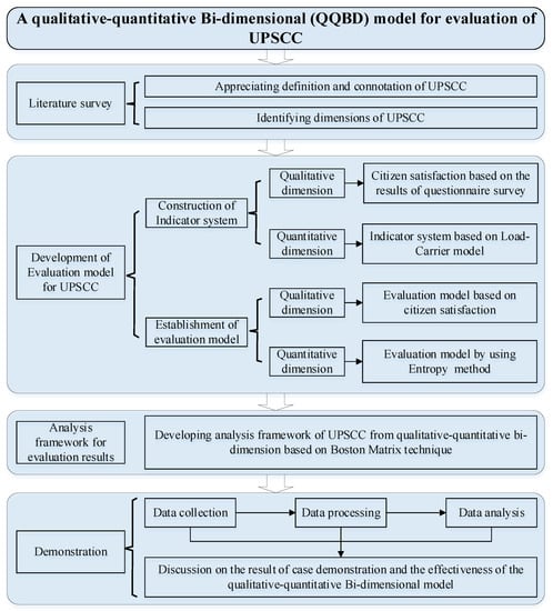 To achieve the research aim, the overall research process of this study was designed as shown in Figure 1. The research framework includes four procedures, namely, literature survey, development of qualitative–quantitative bi-dimensional (QQBD) evaluation model for UPSCC, development of analysis framework for evaluation results, and demonstration of QQBD model application.