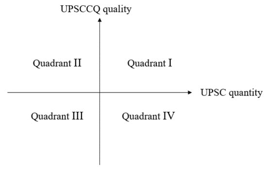 This study used Boston matrix to classify the performance of qualitative UPSCC and quantitative UPSCC. According to the mean score of UPSCC quantity and UPSCC quality, the performance of UPSCC in each city can be divided into the following four quadrants, namely, quadrant I (high quantity, high quality), quadrant II (high quantity, low quality), quadrant III (low quantity, low quality), quadrant IV (high quantity, high quality), as shown in Figure 2.
