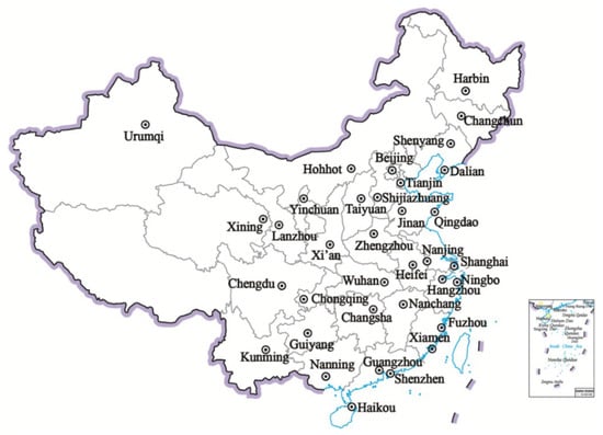 To demonstrate the effectiveness of the model proposed in the previous section, a case study including 35 large cities in China was conducted, and the spatial distribution of these sample cites is shown in Figure 3. In terms of geographical distribution, these 35 sample cities are located across the regions of northeast, east, central and western China, in order to better represent the regional variety in the country. From the perspective of socioeconomic performance, these 35 sample cities contributed to more than 36% of the national GDP and about 19% of the national population for the period from 2014 to 2018 []. Therefore, the selection of 35 sample cities is considered rational, important and representative in demonstrating the UPSCC performance in China. The general information of the case study cities is shown in Appendix A.