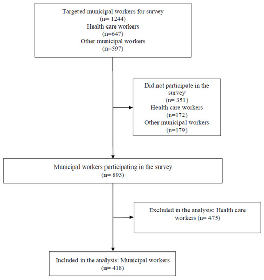 Participants of the study were identified via information provided by the municipality of Prishtina. The target sample of the municipal survey, was consecutive and intended to include all healthcare and administration workers of the municipality of Prishtina. The sample selected for this study was only composed of municipal workers (Figure 1). Out of 579 municipal workers, 179 did not participate because they refused, were on leave, were busy, missing data, or it was not possible to contact them due to no connection or a wrong phone number. The total sample size was 418 municipal workers in Prishtina.