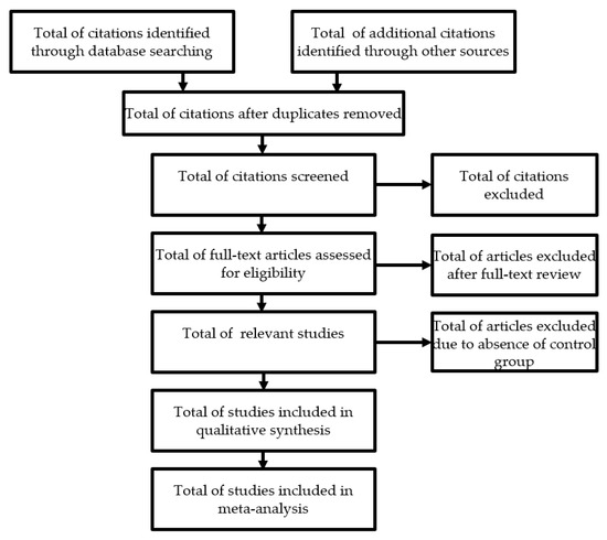 The evaluation of the titles and the abstracts during the selection of the studies will be carried out independently by a single reviewer (RP), with subsequent verification by a second reviewer (AC). All duplicate studies will be deleted immediately. This selection will be made strictly according to the inclusion and exclusion criteria defined in this protocol. When the title and abstract are not sufficiently enlightening, a new search will be carried out looking for the entire article or requesting it from the authors, thus reducing the risk of not selecting important articles. After this selection, the full versions of the potentially eligible articles will be extracted. Any disagreement or inconsistencies will be resolved by discussion between the two authors and, if not resolved, opinion will be sought from the third reviewer. In the case of a lack of important data, they will be requested from the authors of the study. If, after several attempts to contact the authors, the missing data cannot be obtained, we will analyse only the available data and discuss the impact on the final outcomes (Figure 1). The screening process and results will be presented in a Preferred Reporting Items for Systematic Reviews and Meta-Analysis (PRISMA) flow chart [31].