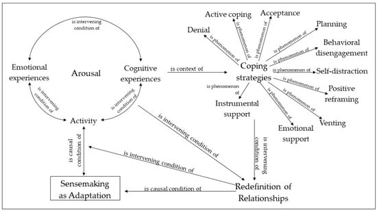 What emerged from this study represents sensemaking processes about the unprecedented and unexpected experience in which participants found themselves. Sensemaking is described as a process concerning identity and meaning building with reference to the social context one is embedded into, from which people gather cues and with which they exchange perspectives about ongoing phenomena and circumstances; it provides people with more stability and motives their actions [], helping them adapting to new circumstances—e.g., during the lockdown. Thus, the core category that emerged was defined as “sensemaking as adaptation”, referring to an iterative and multi-directional process linking individual psychological experience, that is, arousal processes and coping strategies, and their redefinition of relationships stemming from lockdown and pandemic experience. Such a process was aimed at producing individual and shared meanings about pandemic-related circumstances, which showed up as unexpected and unprecedented and broke all the already-known knowledge structures and sensemaking processes [,]. Indeed, giving meaning to these new and unprecedented circumstances, one finds oneself clearly observing a strong need, consistent with the acknowledgement that it can help in integrating complex experiences into one’s identity, preserving the continuity of the latter [,].