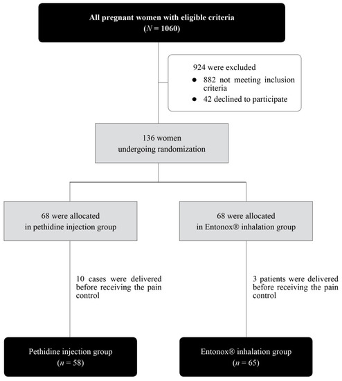 During the study period, a total of 136 pregnant women underwent randomization into two groups: 68 for the pethidine group and 68 for the Entonox® group. However, 10 in the pethidine group and 3 in the Entonox® group had delivery before receiving pain relief. Therefore, 58 and 63 in the pethidine and Entonox® group were respectively available for analysis, as presented in Figure 1.