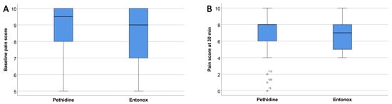 In the pethidine group, there were seven participants who required the second dose of pethidine 4 h after the first dose injection and nine participants changed to use Entonox® inhalation at 30 min after injection. In the Entonox® group, seventeen participants required a pethidine rescue dose after 120 min, and nineteen participants changed to use pethidine injection at 30 min after inhalation, as presented in Table 4.