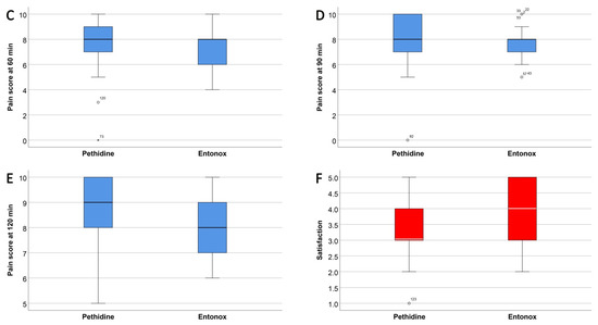Boxplots comparing pain scores at baseline, 30 min, 60 min, 90 min, and 120 min (A–E), respectively; as well as satisfaction score (F), between both groups.