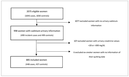 We excluded participants with creatinine concentration <20 mg/dL or >300 mg/dL, as they may be related to clinical conditions that influence creatinine concentrations such as psychogenic polydipsia, creatine deficiency syndromes, muscular and renal disease, as well water adulteration in urinary samples [33,34,35]. In this way, the final sample in this report was 885 women (448 cases and 437 controls) (Figure 1).