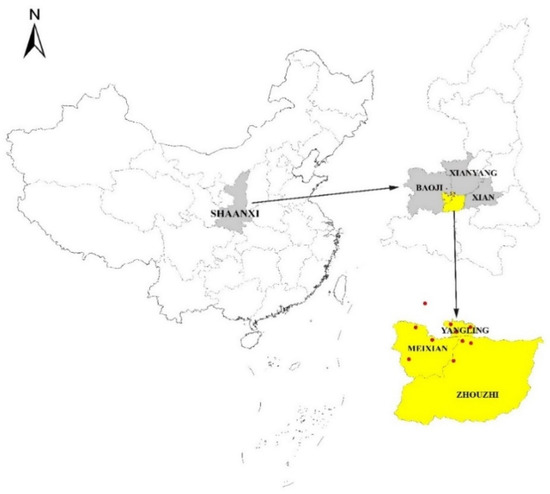 The data used in this paper comes from the household survey data done by the research team in Guanzhong area of Shaanxi Province in 2020. The survey is carried out in two stages. The first stage is carried out in August 2020, with a total of 1012 sample data recovered. The second stage is carried out in November 2020, with a total of 200 sample data recovered. In this survey, samples are selected according to the random stratified sampling method. Three regions of Xi’ an, Baoji and Xianyang are selected according to the economic gradient, and counties and towns are randomly selected in the three regions for investigation (Figure 2). According to the data in the statistical yearbook of Shaanxi Province in 2020, by the end of 2019, the proportion of secondary and tertiary industries in the sample area was 97.0%, 92.0% and 86.8% respectively, and the gradient of economic development level was obvious. All sample data involve 10 townships and 30 administrative villages. In order to ensure the quality of the questionnaire and avoid farmers’ misunderstanding of the questionnaire, this study used the form of one-to-one interview to obtain data, and distributed 1212 farmers’ samples, including 19.67% in Xi’an, 28.79% in Baoji and 51.54% in Xianyang. Combined with the needs of the research content, after eliminating outliers, missing values and nonparticipating samples, 976 samples were determined to be used in this study.