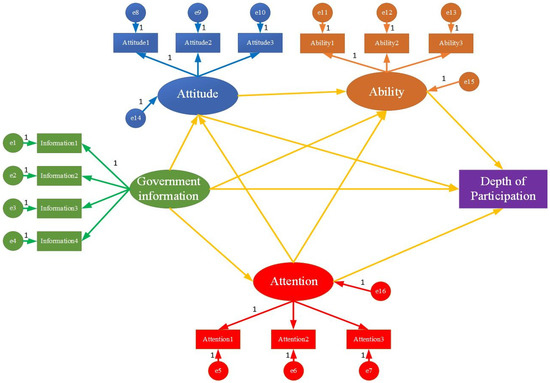 The government information, attitude, ability, and attention involved in the research framework are all latent variables that cannot be directly and accurately observed. Therefore, several measurable variables need to be measured. This model has been divided into two parts: structural model and measurement model (as follows), which is mainly used to analyse the interdependence between a set of potential facets [31]. SEM has had a huge advantage in testing and analysing mediation effects [32]. Considering that this study measures the depth of participation of farmers by the number of farmers participating in governance projects, the depth of participation of farmers is an ordinal variable. If the ordinal variable is regarded as continuous and obeying normal distribution data, the maximum likelihood estimation method (ML) would cause parameter estimation deviation [33]. Muthén proposed to use a robust weighted least squares means and variance estimation method (WLSMV) to solve the problem of parameter deviation caused by ML estimation [34]. Therefore, this study uses Mplus 8.0 software to estimate the model using the WLSMV method.