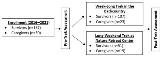 A single-arm, anonymous, pre-post program evaluation study design was implemented by TNT and approved by the Internal Review Board of Northwestern University (STU00215456) to analyze and disseminate these findings (see Figure 1). TNT has gathered anonymous, pre-post, participant-reported outcomes on its nature-based programs since its first trek in 2010. However, in 2016 they also began administering validated short forms of anxiety, depression, and sleep disturbance from the Patient Reported Outcomes Measurement Information System (PROMIS) [33,34] along with their standard survey questions. In addition, during the 2016 season, they collected finger-pricked dried blood spot samples from a subset of participants before and after treks to examine potential changes in levels of chronic inflammation. This report only includes data collected from 2016–2021 in which these outcomes were measured. Note, due to the COVID-19 pandemic, no treks were offered in 2020.