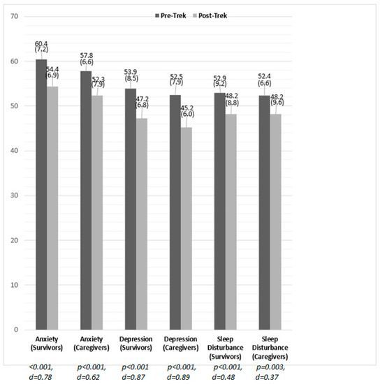 Pre-Post Changes in PROMIS Anxiety, Depression and Sleep Disturbance among Survivors (n = 139–141) and Caregivers (n = 37–38), 2016–2021. Note: Significance values and effect sizes represent pre-post changes within each respective group, and not comparisons between survivors and caregivers.