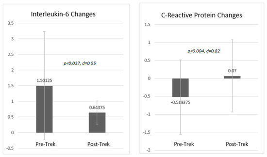A significant, moderate decrease was seen in IL-6 values between pre and post-trek, as well as a significant, large increase in CRP values during this time period. A closer inspection of un-transformed estimates reveals that mean pre-IL-6 values (16.7 pg/mL) were within the mild to moderate range of severity and decreased to within normal limits at the post-test (2.1 pg/mL) [42], which is a clinically meaningful reduction. For CRP, both pre and post values (1.03 mg/dL and 1.60 mg/dL, respectively) were within the normal range [43]. While it may have been expected that both biomarkers rise and fall in unison (suggesting the possibility of a distinctive mechanism of concurrent inflammatory activity), given that CRP is a good indication of muscle inflammation, this slight rise (staying within normal values) may be explained by the physical activity of the treks [44]. Given known associations between symptoms of depression and anxiety and acute inflammation [45,46] and the secretion of pro-inflammatory cytokines [47,48], it is important to advance our understanding of how immersive experiences in nature might “get under the skin”. This said, the evaluation design and very small sample of these biomarker analyses place these findings at the very preliminary level of understanding, which should be considered when interpreting these results.