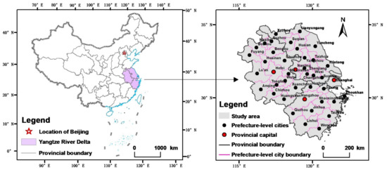 This study uses land use and socioeconomic panel data on 41 cities in the Yangtze River Delta region from 2009–2017 as a sample. In the data, construction land includes the following three types of land: urban-rural construction land, land for transportation and water conservancy, and other construction land. The data come from the Natural Resources Department’s land-use change survey data, and the socioeconomic data come from the China City Statistical Yearbook (2010–2018) [34] and the provincial and municipal statistical yearbooks (2010–2018) [35,36,37,38]. In addition, during the study period, the administrative divisions of Chaohu, Tongling, Anqing, Lu’an and Huainan were adjusted. This study uses the new administrative division as the benchmark and decomposes and merges the corresponding indicators according to the adjustment of the administrative division.
