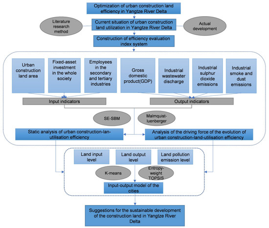 First, based on understanding the current status of construction land use in the Yangtze River Delta region, combined with literature reading, this study screened the input-output evaluation index system for construction land use in line with the actual development of the Yangtze River Delta from the perspectives of land, capital, labour, and output. Second, the article uses the SE-SBM model and the Malmquist–Luenberger model to calculate the static and dynamic efficiency of construction land use in cities in the Yangtze River Delta. Third, we used the entropy-weight TOPSIS method and K-means clustering method to determine the land use types of 41 cities based on the input, output, and pollution emission levels of each city. Finally, combining efficiency characteristics and input-output types, we put forward policy recommendations for optimizing construction land-utilization efficiency. The research design of this article is shown in Figure 2.