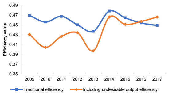 Mean value comparison between the traditional efficiency of urban construction land and the efficiency with undesired outputs in the Yangtze River Delta from 2009 to 2017. (a) Traditional efficiency; (b) efficiency with undesired outputs.