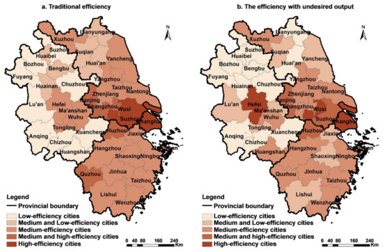 At the city level, traditional efficiency presents regional differentiation, being higher in the east and lower in the west (Figure 4a). Cities with high construction land efficiency are mostly located in the Jiangsu, Zhejiang, and Shanghai regions, which have significant geographical advantages, a high level of urbanisation, and developed economies. The Anhui region, which is located in a remote location in the Yangtze River Delta, has a relatively undeveloped economy. Therefore, coupled with insufficient radiation from the metropolitan area and core cities, the land-use efficiency of cities in this province is generally low. However, if environmental constraints are considered, this regional difference will be decreased (Figure 4b).