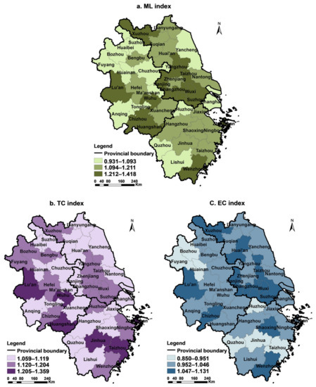 (1) As the largest cities in the region, Suzhou, Wuxi, and Changzhou, among others, have gathered much high-level talent due to their advantages regarding their locations for transportation, economic and technological development, and strong capital strength. These drive TC and EC towards improving regional industrial innovation and management system optimisation (TC > 1.12; EC > 1.05). This has resulted in a significant improvement in the ML (1.418 > ML > 1.212), and the efficiency of construction land increased significantly during the study period. Recently, Lu’an, Huangshan, and Chizhou have reorganised their input production factors, optimised resource allocation, and strengthened their technological updates and creations to promote the rapid growth of ML.