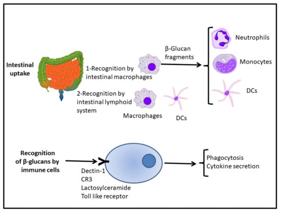 Initial stages in the immunomodulatory action of β-glucans. Scheme representing the initial steps during the intestinal uptake and the subsequent interaction with receptors located in immune cells. See text for more details. Abbreviations used: DCs, dendritic cells. Images modified from Wikimedia commons.