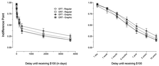 Mean indifference points (±SEM) on the delay discounting task for Experiment 1. EFT—episodic future thinking; ERT—episodic recent thinking. Left panel: delays presented on a linear x-axis to depict the shape of the discounting function. Right panel: delays presented on an x-axis with intervals equidistantly spaced to facilitate examination of all values.