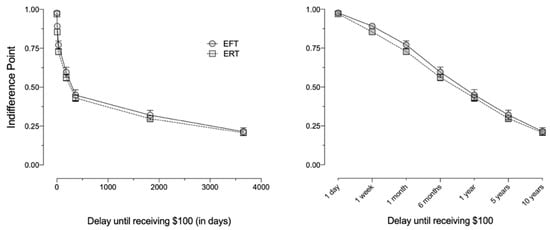 Mean indifference points (±SEM) on the delay discounting task for Experiment 2. EFT—episodic future thinking; ERT—episodic recent thinking. Left panel: delays presented on a linear x-axis to depict the shape of the discounting function. Right panel: delays presented on an x-axis with intervals equidistantly spaced to facilitate examination of all values.