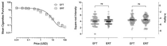 Hypothetical cigarette purchasing varied as an orderly function of increasing price (Figure 5), where Equation 1 described the mean consumption data well for the EFT (R2 = 0.96; RMSE = 0.16) and ERT (R2 = 0.97; RMSE = 0.17) groups. Results indicated a significant effect of FTCD scores on intensity (F1,153 = 51.81, p < 0.001, = 0.25); however, no significant differences emerged as a function of the episodic condition (F1,153 = 3.52, p = 0.06, = 0.02). Similarly, FTCD scores significantly predicted the α parameter (F1,151 = 10.56, p = 0.001, = 0.07), although there were no significant differences due to the episodic condition (F1,151 = 0.45, p = 0.51, = 0.003).