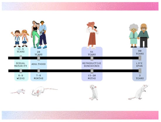 A crucial factor in the study of gender-affirming HT is the duration of treatment and the age correlation between humans and animals (Figure 2). HT can commonly start during adolescence (Tanner stages 2 to 3) [], corresponding to 8–9 weeks in rodents [], and it lasts for a long time, potentially even for the whole life of TG people. When a research study focuses on reproductive and fertility effects, the minimum time of HT administration in rat should be 90 days, corresponding to 8–9 years in humans [], to allow a congruous recovery time without HT to revert cyclicity in females, while remaining in the time window to possibly become pregnant, and spermatogenesis in males. The age correlation and the duration of treatment are also important for the evaluation of potential long-term effects of HT on the different body districts and they can be modulated accordingly.