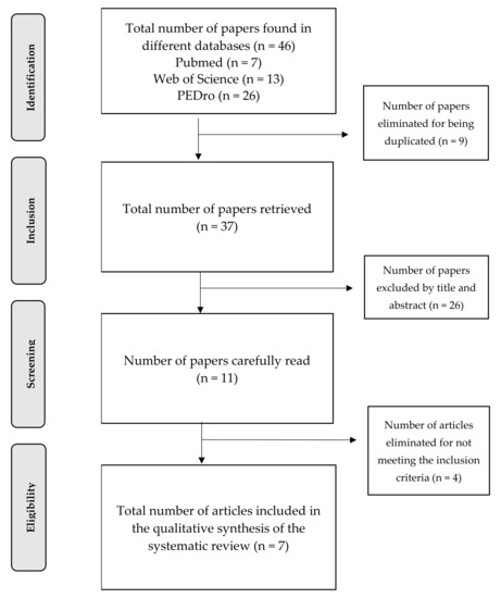 A total of 46 clinical trials were obtained, out of which 39 were excluded (nine for being duplicated, 26, by title and abstract, and four for not meeting the inclusion criteria), leaving a total of seven papers included. In order to facilitate the understanding and follow-up of this systematic review, a flow chart was created showing the different stages completed for the selection of the studies (Figure 1).